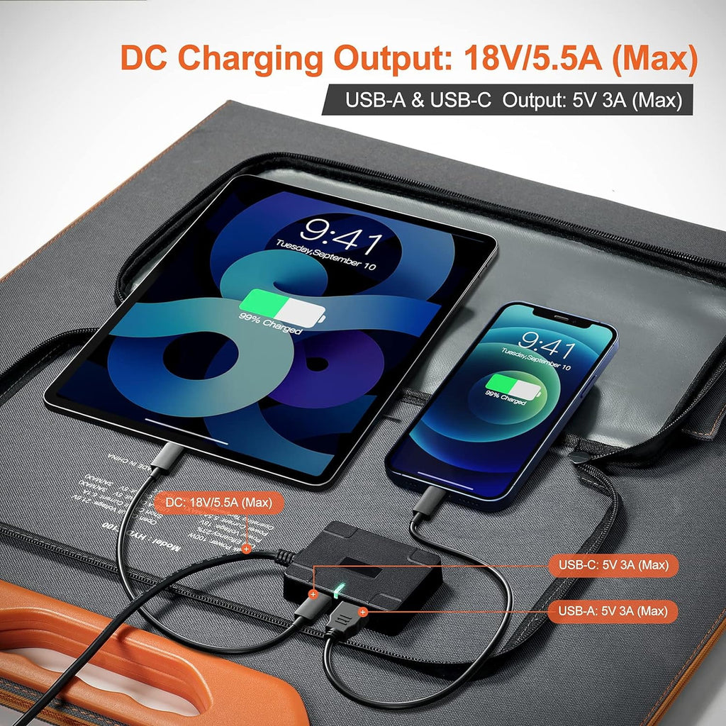 【Wide Compatibility with Solar Generators】100W portable solar panel comes with multiple connector options (XT60/7.90.9mm/8.02.0mm/3.51.35mm/Anderson DC adapter), ensuring it works seamlessly with most power stations, including ECOFLOW, Jackery, Goal Zero, Bluetti, Renogy, and FlashFish. Equipped with 1 USB-C (5V/3A) and 1* USB-A (5V/3A) port, it allows direct charging for two small devices simultaneously.