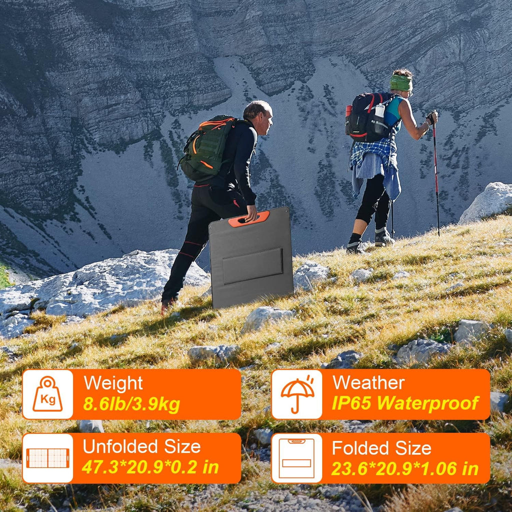 【Compact & Easy to Carry】Features dual adjustable kickstands for better sun exposure and an easy-to-fold two-panel design. Weighing only 8.16 lbs and equipped with a comfortable TPE handle, it’s ideal for outdoor trips, camping adventures, or off-grid living.