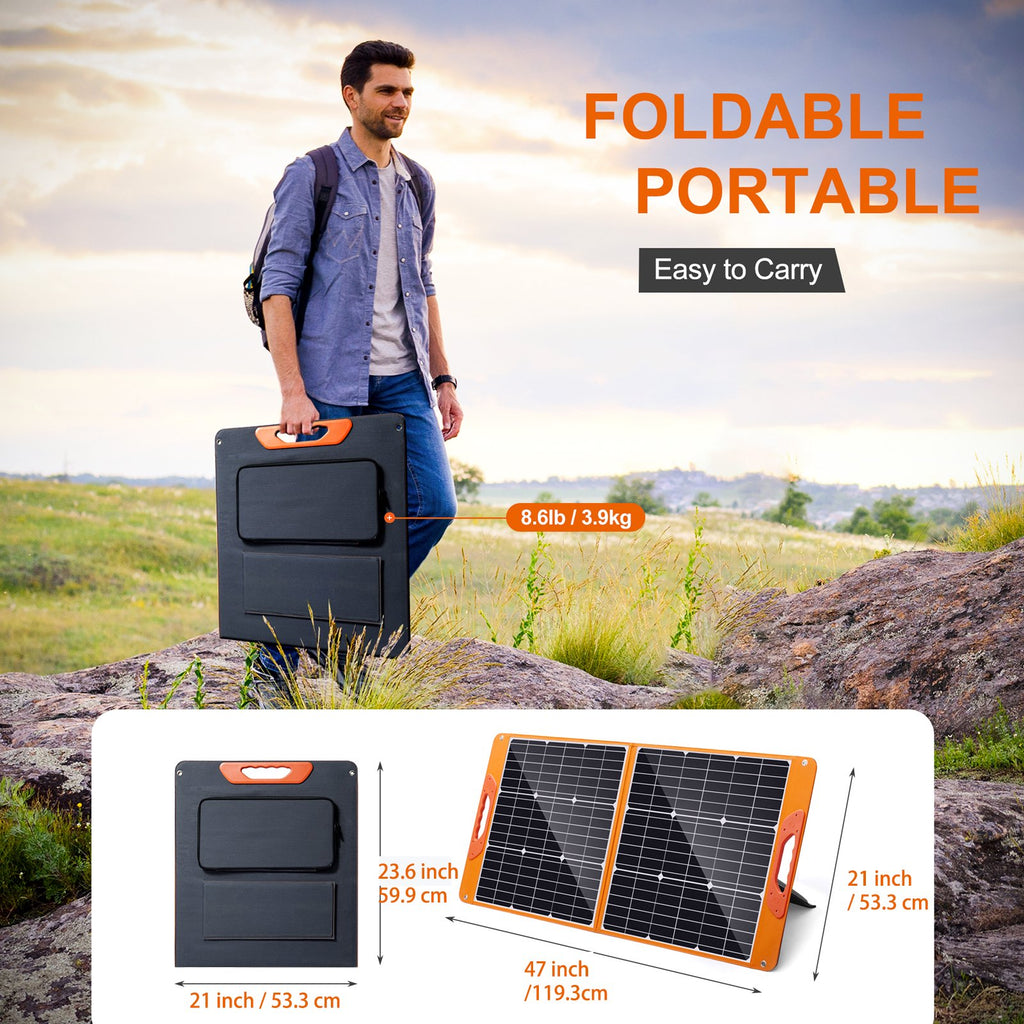 【Compact & Travel-Friendly Design】Featuring dual adjustable kickstands, this 100W solar panel helps you capture optimal sunlight. The 2-fold structure, lightweight 8.16 lb body, and comfortable TPE rubber handle make it easy to carry for camping, hiking, RV trips, or off-grid adventures.