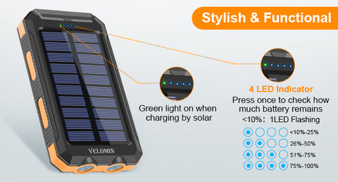Four power indicator lights show the battery level or charging status, with each indicator representing 20% of battery life. When all LED indicators are lit and turn solid, it means your solar charger is fully charged.