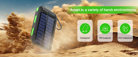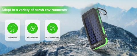- 【 High-Quality Ultra Portable Solar Charger】: 20000mAh solar bank is made of reliable and eco-friendly ABS+PC+Silicone material which performs excellent ability to dissipate heat. This rugged solar power bank has a protective cover is attached to the outside of the charging port, so it has a waterproof and dustproof function. In addition, it is also equipped with a carabiner, which you can hang on your backpack while climbing the mountain and charge this power bank through solar energy.