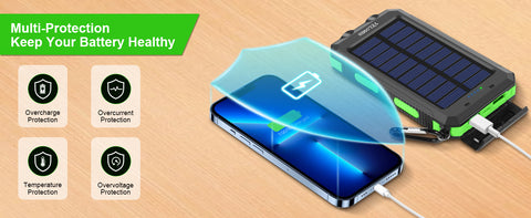 - 【Two Different Charging Methods 】: 20000mAh External battery charger with solar panel can recharge by sunlight or outlet. In daily life, It's highly recommended to charge it via a wall outlet, take the solar charging feature as the emergency backup solution. The USB battery pack can be regarded as a nice gift. The USB cable in the package is only used to charge the solar charger. It is not recommended to charge other devices, which may slow down the charging efficiency due to incompatibility.