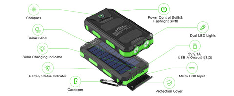 - 【Practical 2 Flashlights 】: Solar phone charger is featured with 2 powerful brights flashlights and a compass. 2 LED flashlights can be used as flashlights with Steady-SOS-Strobe mode for emergencies. Five pilot indicators indicate the status of the battery charger timely. Greenlight on when charging by a solar, blue light on when USB charging. The total power of 74Wh is suitable for air travel. The solar travel power bank is an ideal companion for camping, hiking, and other outdoor activities.
