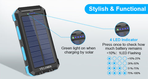 Four power indicator lights show the battery level or charging status, with each indicator representing 20% of battery life. When all LED indicators are lit and turn solid, it means your solar charger is fully charged.