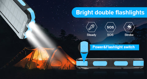 The solar bank with dual flashlights has 3 powerful modes(Steady-SOS-Strobe mode). It leads you through darkness and emergencies as a lifesaver. Make sure it's fully charged, otherwise it won't be enough to turn on the flashlights.